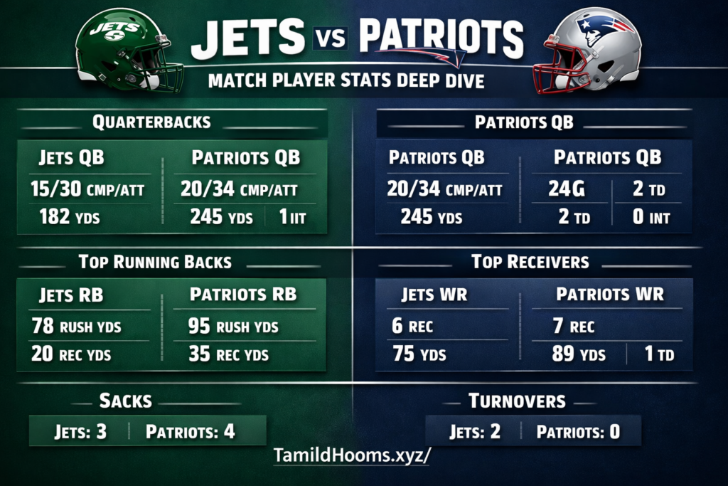 In recent Jets vs Patriots games, quarterback efficiency has mattered more than volume. Low-turnover performances have historically correlated with wins, reinforcing the idea that discipline outweighs explosiveness in this rivalry new york jets vs new england patriots match player stats.